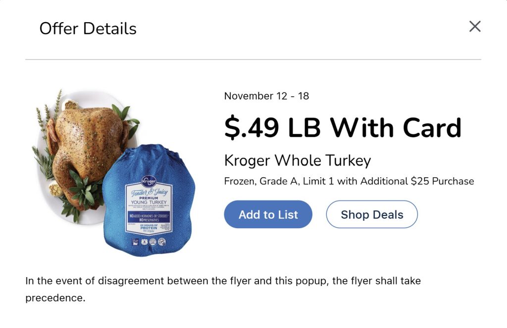 Kroger is also getting into the Thanksgiving grocery competition, as they have for as long as I can remember. Kroger usually offers weekly specials on baking and pantry staples, and in my memory, they’ve had turkeys on sale for extremely low per-pound prices with an additional $25 purchase.